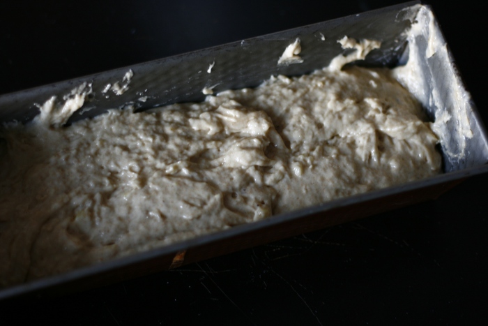 Backpulver und Mehl nach und nach hinzusieben und mit den Knethaken des Handrührgerätes gut durchkneten, bis der Teig eine feste Masse ergibt. Sollte er zu fest sein, einfach einen kleinen Schuss Wasser dazu. In eine gefettete Kastenform geben (es muss nicht gleichmäßig sein, der Teig schmilzt im Ofen auf eine Ebene, bevor er anbäckt).