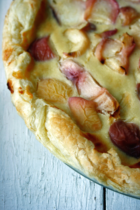 Backofen auf 180° C vorheizen. Pfirsiche waschen und in Scheiben schneiden, Kern entfernen. Blätterteig in eine gefettete Tarteform legen und alles überstehende abschneiden, gegebenenfalls Ränder mit den abgeschnittenen Stücken ergänzen. Gemahlene Mandeln, Eier, Zucker und Milch zu einer Masse verrühren. Diese sollte nicht zu fest und nicht zu flüssig sein, je nachdem mehr oder weniger Milch dazugeben. Die Masse auf den Blätterteig gießen, die Pfirsich-Scheiben darauf legen und dann die Ränder auf die Füllung “herunterklappen”. Die Tarte nun für 20 – 25 Minuten auf mittlerer Schiene backen. Die Ränder sollen knusprig und goldbraun sein und die Masse fest. Kurz abkühlen lassen, dann noch warm servieren.