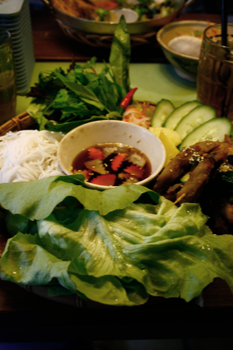 Für etwa 8 Euro hatte ich diese Riesenplatte mit gegrillten Tofuspießen, Reisnudeln, Dip und Salat. Auch die hausgemachten Eistees (Zitronengras, Ingwer etc.) sind phantastisch. Auf jeden Fall einen Besuch wert!
