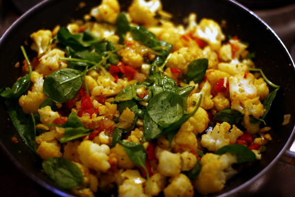 Dann den fertig gegarten Blumenkohl in die Pfanne geben und die Gewürzmischung mit einem Pfannenwender gut verteilen. Dann die frischen Spinatblätter unterheben (nur kurz ziehen lassen!). Den Saft einer halben Limette darüber ausdrücken, den gemahlenen Kumin dazugeben und fertig!