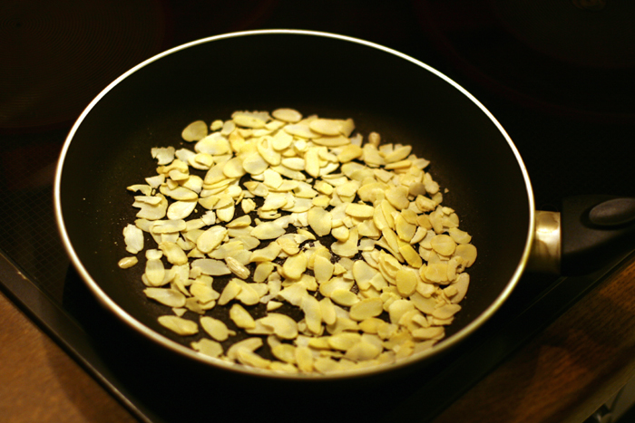 Heat a pan without fat and roast the almond slivers until golden brown.