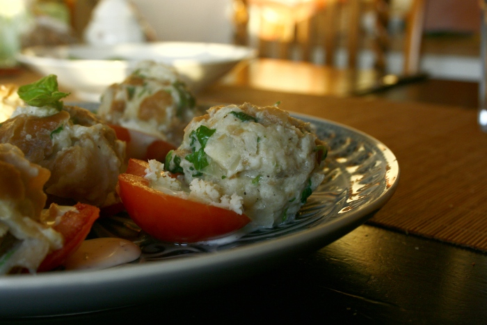 In der Zwischenzeit Tomaten waschen und in Scheiben schneiden, dann auf zwei Tellern anrichten. Mit Salz und Pfeffer würzen. Creme fraîche mit Zitronensaft, Salz und Pfeffer verrühren. Die Mischung über den Tomaten verteilen und mit geriebenem frischen Meerrettich bestreuen. Die Knödel mit einem Schaumlöffel aus dem Wasser nehmen, kurz abtropfen lassen und auf den Tomaten anrichten.