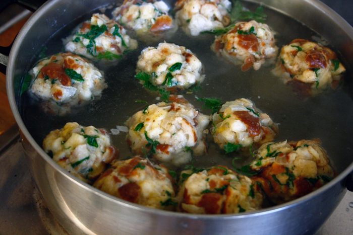 In einem breiten Topf Salzwasser erhitzen, wenn es fast kocht herunterschalten (sollte nicht sprudeln) und die Knödel hineingeben. Sie müssen jetzt etwa 15 – 20 Minuten im siedenden Wasser garen.
