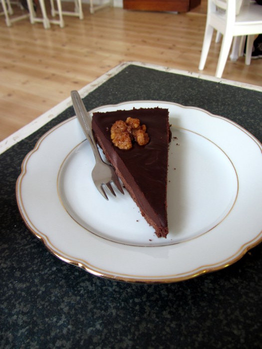 Wir bestellten noch zwei Kuchen. Einer kam. Der Schokoboden war annehmbar, die vegane Sahne schmeckte, als ob noch ordentlich Kokosfett drin ist. Insgesamt sehr mächtig, essbar, aber keine wirkliche Gaumenfreude.