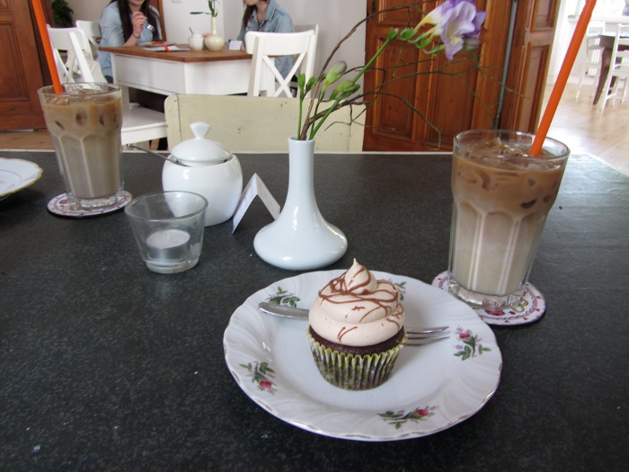 Erst recht jene, die sagen “Waaas? Vegan backen? Kaffee ohne Milch? Also ich weiss ja nicht…”: ich sag nur so viel – ihr werdet begeistert sein! Die Köchinnen aus dem Vux sind das allerbeste Beispiel dafür, dass man keine tierische Produkte verwenden muss, um unfassbar leckeren Eiskaffee, Kaffee, Cupcakes, Waffeln und Kuchen sowie lecker belegte Bagels zu zaubern. Ich hätte mich am liebsten durch die ganze Speisekarte gefuttert, gereicht hat der Appetit aber nur für eine Chili-Schokoladentarte und einen Nougat-Cupcake sowie Eiskaffee. Überzeugt euch selbst, die Fotos sprechen für sich!