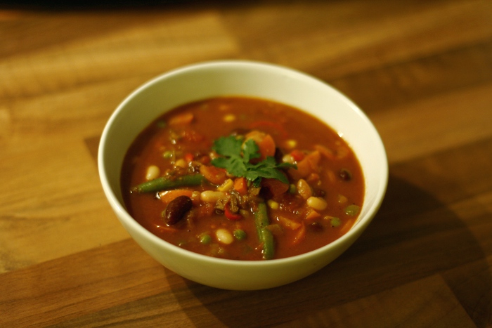 Bei mir gab es das Chili außerdem ohne Edelpilzkäse und Erdnüsse, die Kombi konnte ich mir nicht so gut vorstellen. Ansonsten habe ich mich genau an das Rezept gehalten und fand es wirklich phantastisch! Ohne den Käse ist das Rezept auch vegan.