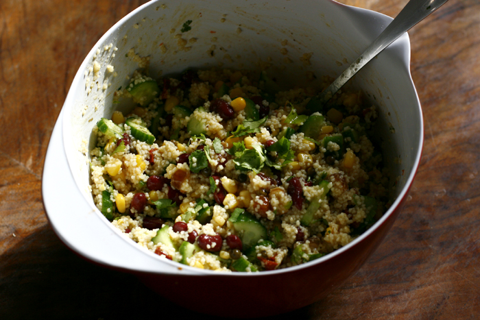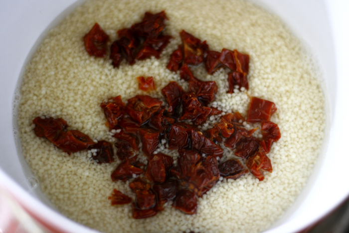 Couscous mit kochendem Wasser aufgiessen und Gemüsebrühe hinzugeben. Tomaten und Datteln fein hacken und dazugeben.