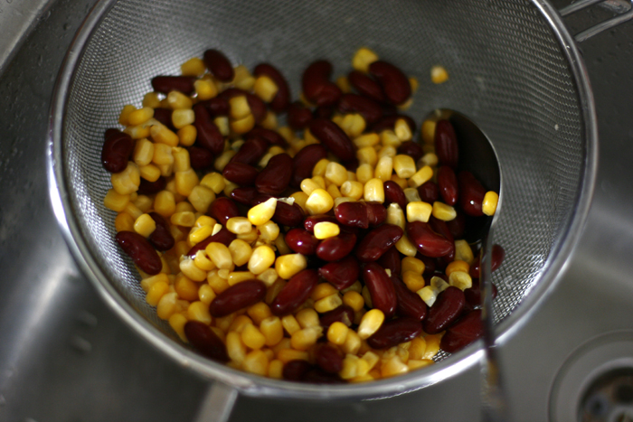 Mais, Pfefferkörner und Bohnen gut abspülen und dazugeben.
