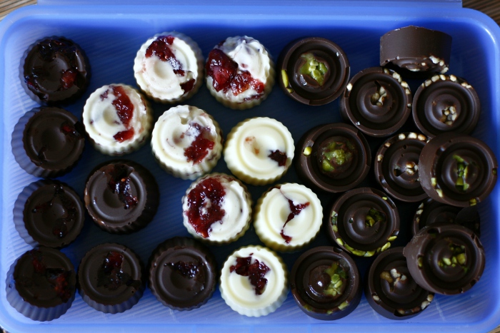 Wer mag, kann auch noch Pistazien- und Krokantpralinen machen, dann einfach die doppelte Menge Schokolade nehmen und eine zweite Form mit gehackten Pistazien und Haselnuss-Krokant-Stückchen einstreuen, bevor man die Pralinen ausgießt.