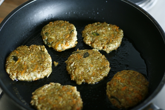 In der Zwischenzeit kann man schon mal den Backofen für die Potato Wedges/Pommes vorheizen. Eine Pfanne mit Öl erhitzen. Aus der Masse Kugeln formen, diese platt drücken und in der heißen Pfanne von beiden Seiten knusprig anbraten.