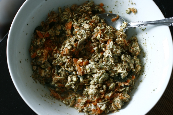 Die Karotte und Zucchini waschen und fein reiben. Wasser mit dem Wasserkocher aufkochen und 150 – 200 ml Wasser über die Dinkelbratlinge-Mischung gießen. Die geriebenen Karotten, Zucchini, Salz und Pfeffer (sparsam!) dazugeben und das Ganze etwa 20 Minuten ziehen lassen.