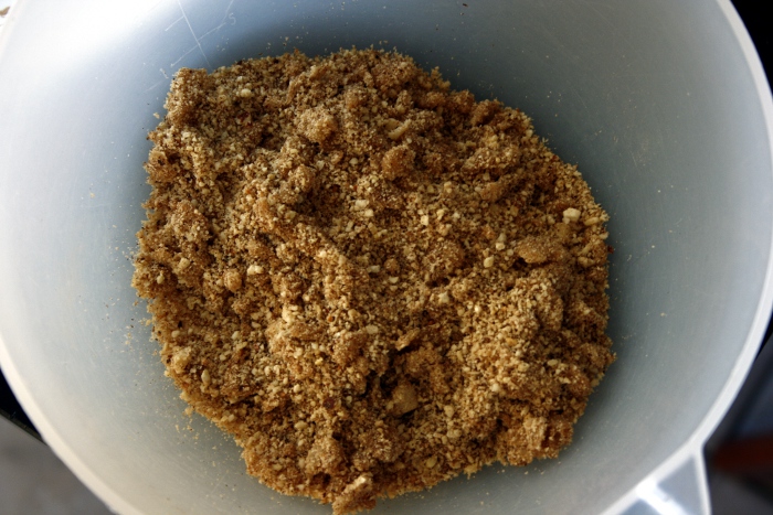 Trockenfrüchte für 10 Minuten in etwas lauwarmem Wasser einweichen (sie sollten damit bedeckt sein). In der Zwischenzeit die Nüsse im Mixer zerkleinern und mit Zimt, Zucker, gemahlenem Kardamom, Nelkenpulver und