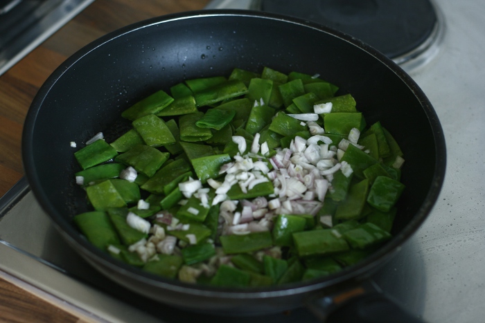 In etwas Olivenöl die Zuckererbsenschoten, Schalotten und zuletzt den Knoblauch anbraten, die Erbsen hinzugben und bei geschlossenem Deckel garen.