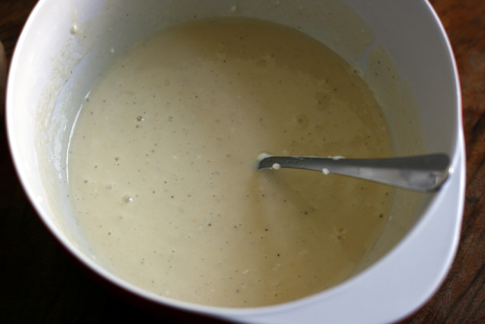 2 Limetten auspressen und zusammen mit dem Frischkäse, dem Zucker, dem Vanillezucker, den Eiern und der Maisstärke zu einer Creme verrühren.