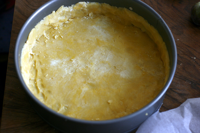 Den Teig dann zwischen zwei Plastikfolien oder Backpapier ausrollen. Eine Springform mit Backpapier auslegen, einfetten, den ausgerollten Teig hineinlegen und die Ränder gleichmässig hoch festdrücken.