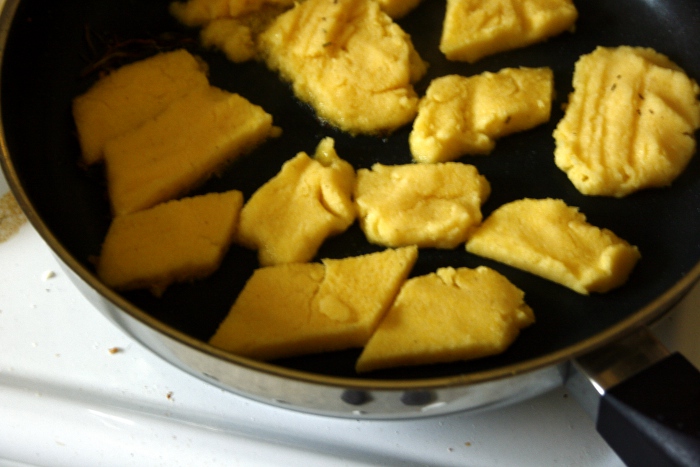 Gebratene Polenta mache ich ziemlich häufig, denn die knusprigen Stückchen sind das perfekte Fingerfood. Passt auch hervorragend zu gebratenem Mangold oder anderem Gemüse als Beilage.