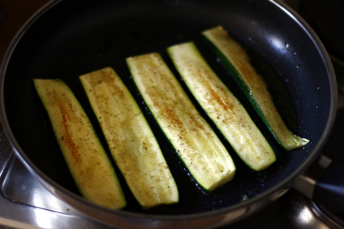 Olivenöl in der Pfanne heiß werden lassen, Zucchini ca. 8 – 10 Minuten von beiden Seiten salzen, pfeffern und anbraten lassen, dabei regelmässig wenden.
