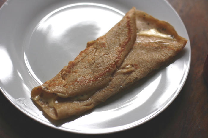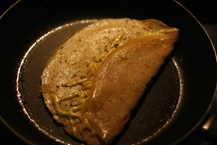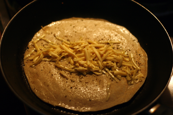 Für die mit Käse gefüllten Palatschinken habe ich direkt nach dem Wenden die Oberseite mit Käse und Oregano bestreut und eine Prise Salz und Pfeffer darübergegeben, der Käse schmilzt dann während die Unterseite gar wird.