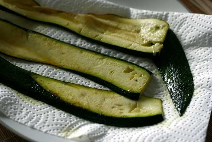 Zucchini in dünne Scheiben schneiden. Knoblauch schälen und leicht andrücken. In einer beschichteten Pfanne Olivenöl erhitzen, Knoblauch hinzugeben und nach und nach die Zucchinischeiben bei geschlossenem Deckel weich garen. Anschließend auf etwas Küchenpapier abtropfen und abkühlen lassen.