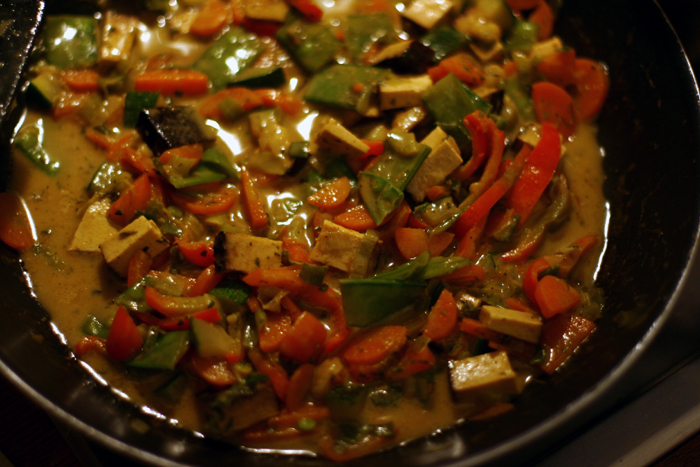 Zuerst das Wasser für den Reis aufsetzen. Gemüse waschen, kleinschneiden und in Öl anbraten (zuerst Karotten, dann Zuckerschoten, dann Frühlingszwiebeln und zuletzt die Paprika). Räuchertofu würfeln und mitbraten. Currypaste dazugeben und kurz anschwitzen, dann mit Kokosmilch aufgiessen und ca. 10 Minuten köcheln lassen, bis das Gemüse weich ist.