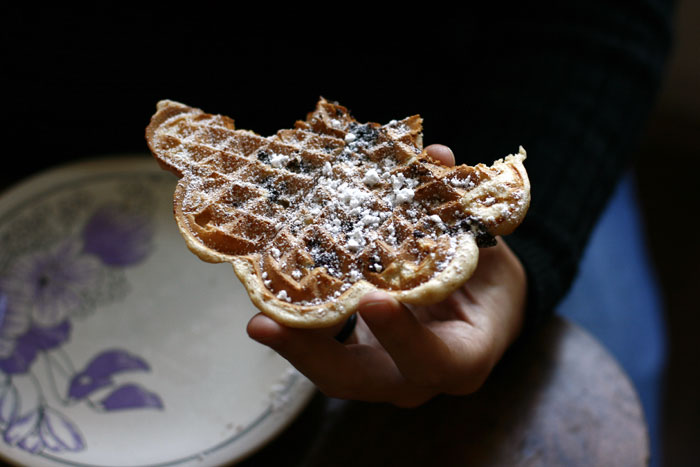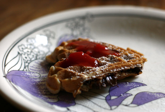 Man kann auch fein gehackte dunkle Schokolade in den Teig hineinrühren, dann sehen die Waffeln innen so aus: