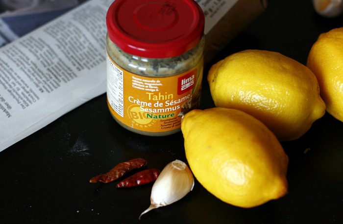 bis die Masse eine cremige Konsistenz hat. Sesampaste, Olivenöl und