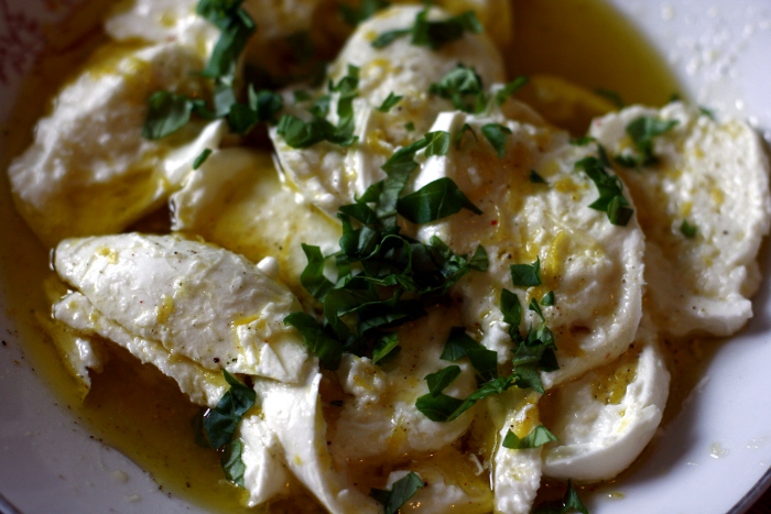 Dieses Rezept heißt in der Zeitschrift “Zitronenmozzarella mit Knusperbasilikum”. Das Knusperbasilikum war mir zu viel Aufwand, ich habe einfach normales Basilikum gehackt und dazu gegessen.