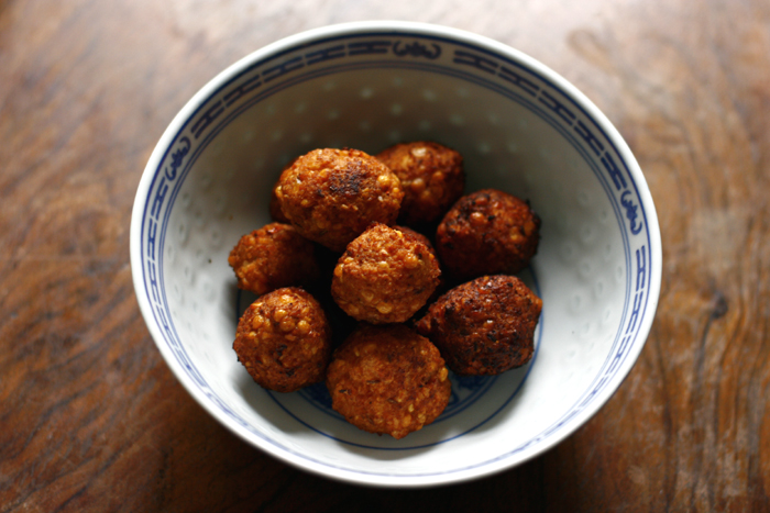 Aus der Masse kleine Bällchen formen und in das heisse Öl geben (die richtige Temperatur ist erreicht, wenn man ein bisschen von der Linsenmasse hineingeben kann und es sofort anfängt zu schäumen und frittiert wird… es sollte nicht anfangen zu rauchen!).