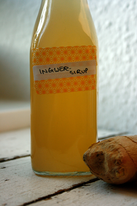 Ingwer gründlich waschen und dann zuerst längs in Scheiben, dann in dünne Streifen schneiden. Wasser in einem Topf erhitzen, Zucker und Ingwerstreifen hinzugeben und mindestens 45 Minuten köcheln lassen. Anschließend durch ein Sieb giessen und noch heiß in eine saubere Flasche oder Gläser füllen. Angebrochen hält sich der Sirup im Kühlschrank mindestens eine Woche.