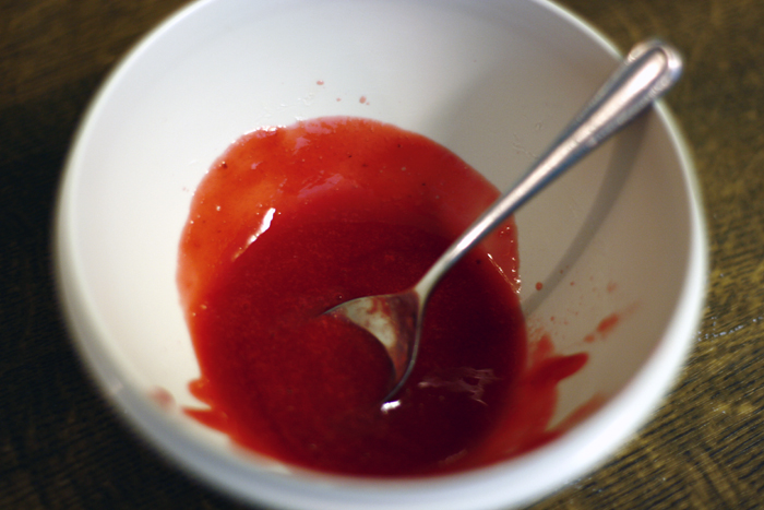 1 EL Zucker und 2 EL Honig karamellisieren lassen, kurz vom Herd nehmen. Mit dem Johannisbeerpüree ablöschen und alles 1 – 2 Min. köcheln lassen, bis der Karamell gelöst ist. Dann kurz abkühlen lassen.