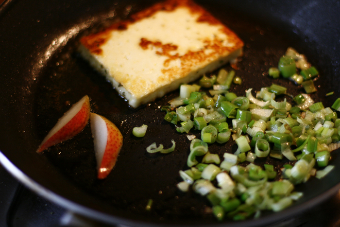 Kartoffeln schälen, halbieren und in einem Topf mit viel Wasser zum Kochen bringen (sie brauchen ca. 15 – 20 Minuten, bis sie wirklich durch sind – man hätte jetzt also noch etwas Zeit, bevor man weitermacht!). Frühlingszwiebeln putzen und in feine Ringe schneiden. Halloumi salzen / pfeffern. Olivenöl in einer Pfanne erhitzen, Halloumi hineingeben und von beiden Seiten knusprig anbraten (nach dem ersten Mal wenden die Frühlingszwiebeln hinzugeben). Aus der Birne 2 – 3 Spalten pro Person herausschneiden, den Rest schälen und entkernen und in den letzten paar Minuten zu den kochenden Kartoffeln geben. Die Birnenspalten noch ca. 1 Minute in der Pfanne mitanbraten.