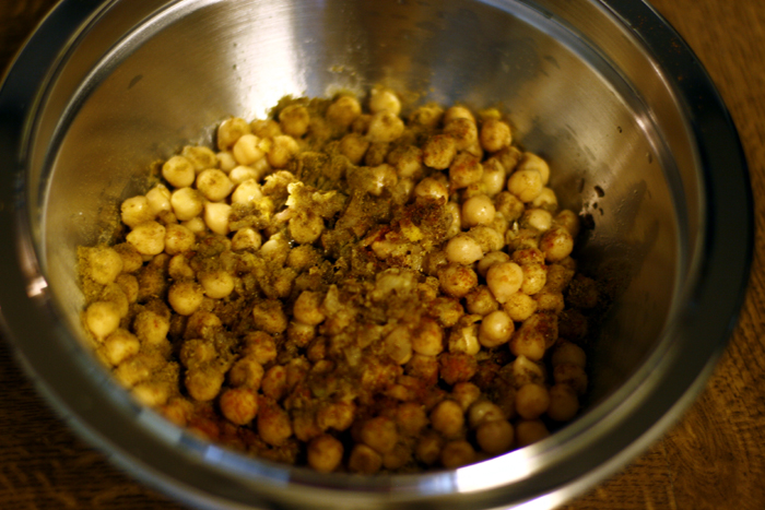 Kichererbsen mit Salz, Cayennepfeffer, Kreuzkümmel und Garam Masala würzen und die Limette darüber ausdrücken.