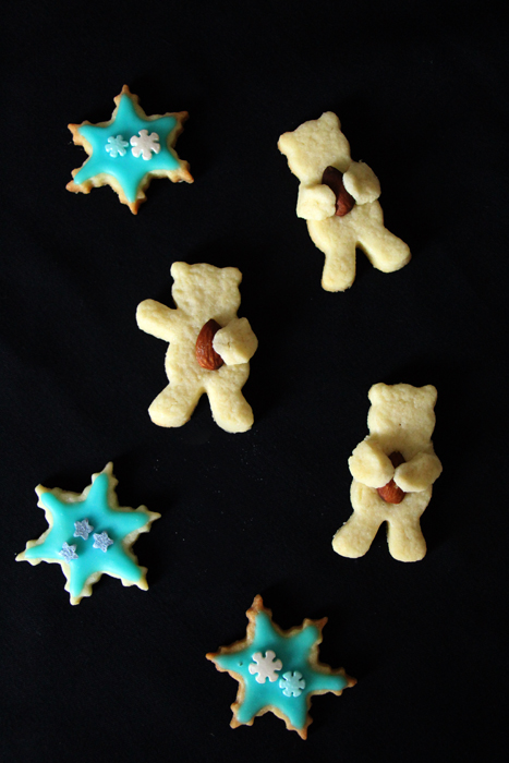 Die klassischen Butterplätzchen werden bei mir zu Weihnachten immer gebacken, ich verwende aber jedes Jahr andere Förmchen. Seit ein paar Wochen begegnen mir überall die Mandel-Bärchen – die süßen Teddys halten eine Mandel in den Armen und sind das “must have” in der diesjährigen Weihnachtsbäckerei! Ich habe den Butterplätzchenteig mit etwas Bittermandelaroma verfeinert, so dass die Bären dezent nach Marzipan schmecken. Aus dem Teig kann man auch Sterne und andere Formen ausstechen und mit Zuckerguss dekorieren.