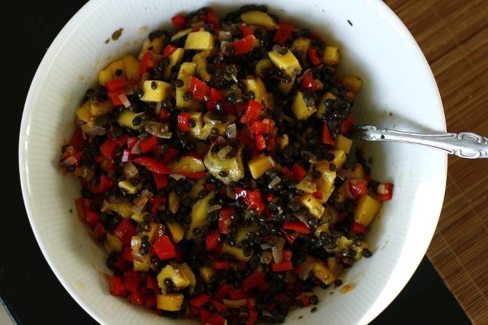 Linsen, Mangowürfel, Paprika und Schalotten mit Sesamöl, Sesamgewürz, Salz und Pfeffer abschmecken und ca. 10 Minuten ziehen lassen. Wer mag, kann kurz vor dem Servieren noch etwas gehackten Koriander darüber streuen.