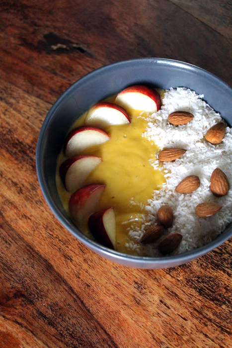 Momentan ist es morgens oft grau und kalt, da brauche ich sonnengelbe Mango und leckere Früchte. Wenn man mit einer bunten Schale Obst in den Tag startet, fühlt man sich gleich viel besser! Deshalb ist eines meiner Lieblings-Frühstücksrezepte derzeit die Mango Smoothie Bowl. Smoothie Bowls unterscheiden sich gar nicht so sehr von Smoothies, sie sind nur etwas dickflüssiger und werden mit Toppings serviert. Zum Beispiel die üblichen Superfood-Verdächtigen wie Kakaonibs, Chia-Samen oder Goji-Beeren, aber ihr könnt natürlich alles dazugeben was ihr gerade daheim habt. Bei mir waren das zum Beispiel Kokosraspeln, Mandeln und Bergpfirsiche. Je bunter desto besser, das Auge isst schließlich mit 😉