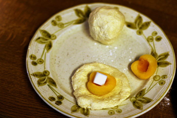 Dann mit einem Stück Würfelzucker füllen (oder einfach einen halben Teelöffel Zucker hineinstreuen). Aus dem Teig eine Rolle formen, in 8 Stücke teilen, flachdrücken. Eine Marille in die Mitte setzen, den Teig darüber hüllen und Knödel formen.