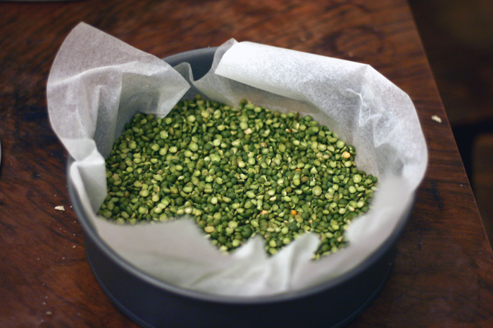 Backpapier darauf legen und getrocknete Bohnen oder Erbsen darauf geben.