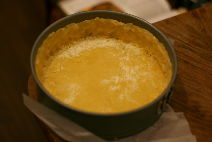 Eine Springform einfetten, den ausgerollten Teig hineinlegen und die Ränder gleichmässig hoch festdrücken.