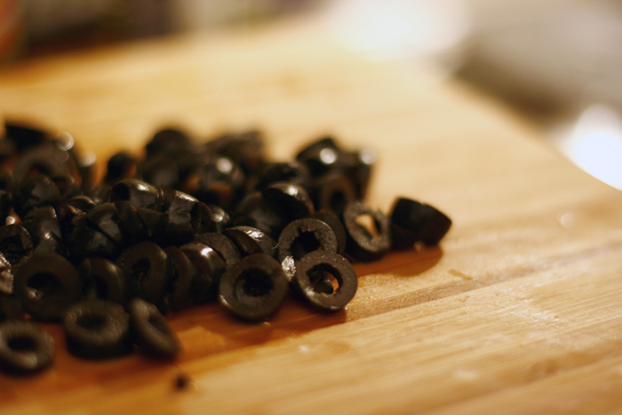 Zwiebeln fein hacken und in Butter glasig anbraten, dann die Tomaten dazugeben und kurz aufkochen lassen (falls zu viel Flüssigkeit dabei sein sollte, abgießen weil sonst die Quiche matschig wird). Oliven, Salz und Pfeffer hinzufügen, dann die Füllung in den Teig gießen.