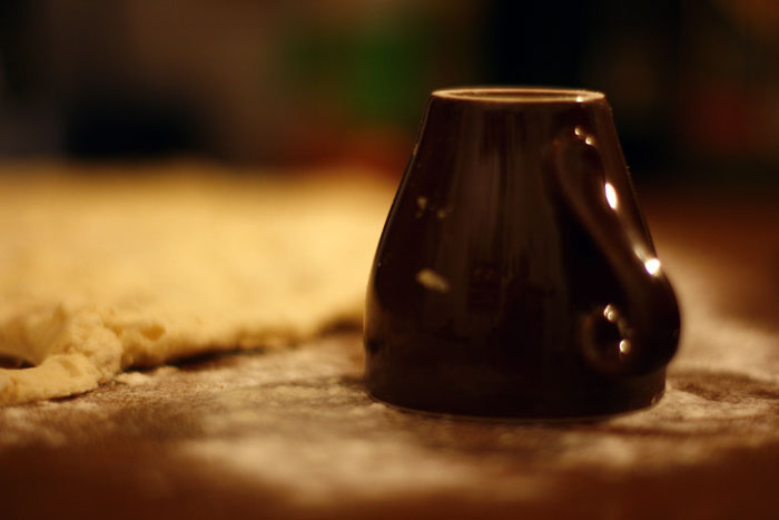 Den Teig dann auf einer bemehlten Arbeitsfläche flach drücken, so dass er ca 2 cm hoch ist. Mit einer runden Ausstechform Teigkreise ausstechen. Ich verwende eine Espresso-Tasse: