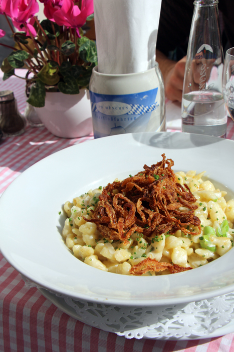 Im Asam Schlössl war ich kürzlich erst wieder essen – für ca. 35 Euro kann man dort zu zweit mit Getränken herrlich bayerisch essen gehen. Ich habe mir einen kleinen gemischten Salat und Kasspatzn (Käsespätzle) mit einem riesen Berg Röstzwiebeln oben drauf bestellt (und konnte den Rest des Tages nichts mehr essen, die Portion spricht wohl für sich…).
