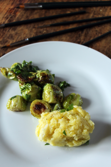 | Ofen-Rosenkohl mit Kartoffel-Petersilwurzel-Pürree |