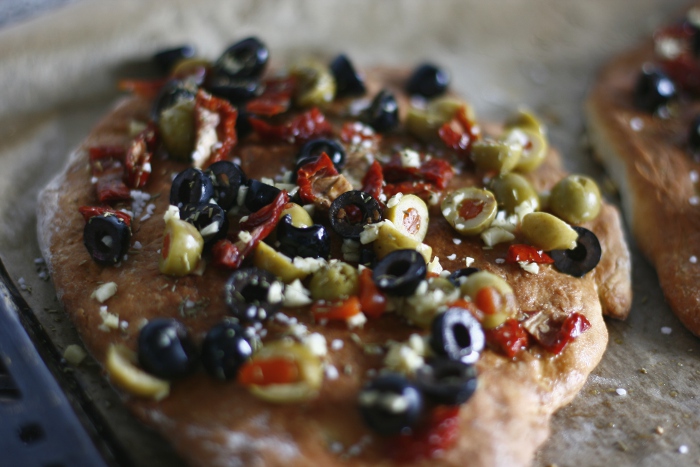 Das Brot nun in den heißen Ofen schieben. Ich würde sagen, maximal 15 Minuten backen, dann spätestens das Toping darauf verteilen: Knoblauch, Tomaten und Oliven mit Öl vermengen und auf zusammem mit dem gehackten Rosmarin auf dem Brot verteilen und sanft andrücken. Mit grobem Meersalz bestreuen und für weitere 15 – 20 Minuten im Ofen lassen, gesamte Backzeit also in etwa 30 – 35 Minuten.