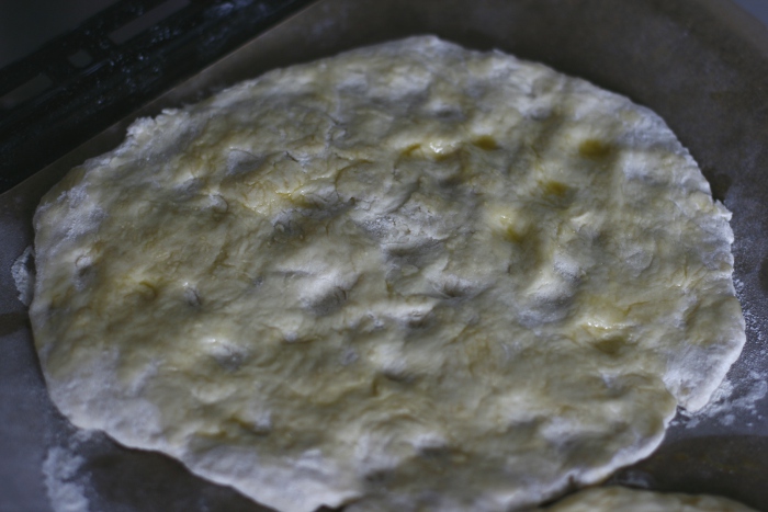 Die Arbeitsplatte mit reichlich Mehl bestäuben. Ein Backblech mit Backpapier belegen. Den Teig zu einem runden Fladen mit etwa 2 1/2 cm Dicke formen. Mit dem Finger in regelmäßigen Abständen Vertiefungen bis fast auf den Boden in den Teig drücken. (Bei mir waren die Fladen nun sehr flach, deshalb würde ich empfehlen, sie nochmal mindestens 15 Minuten gehen zu lassen, damit sich der plattgedrückte Teig wieder etwas hebt…).