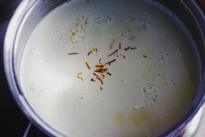 Hafer- oder Mandelmilch mit dem Wasser zum Kochen bringen (ich habe einfach 600 ml Sojamilch genommen). Zucker, Salz, Safranfäden und Reis einrühren und auf kleiner Flamme unter ständigem Rühren quellen lassen. Wie ihr schon wisst, verwende ich persönlich den Safran von Wibert at home, der ist qualitativ einfach phantastisch.