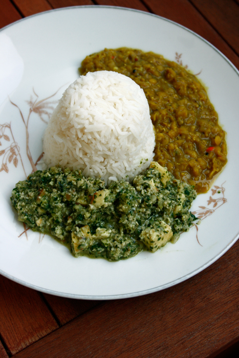 In einer Pfanne etwas Öl auf geringer Temperatur erhitzen. Lorbeer, Kardamom, Zimt, Ingwer und Knoblauch zugeben, dann Temperatur erhöhen und den gewürfelten Paneer zugeben. Für ca. 5 Minuten anbraten, dann gemahlenen Koriander und Kreuzkümmel zugeben und für weitere 2 Minuten braten, dabei häufig wenden, damit nichts ansetzt. Die grüne Paste unterrühren und nochmal 2 Minuten braten. Salz, Zucker, Limettensaft und ca. 100 – 200 ml Wasser zugeben. Erhitzen und mit Reis, Chapati, Mango-Chutney und Masoor Dhal servieren.