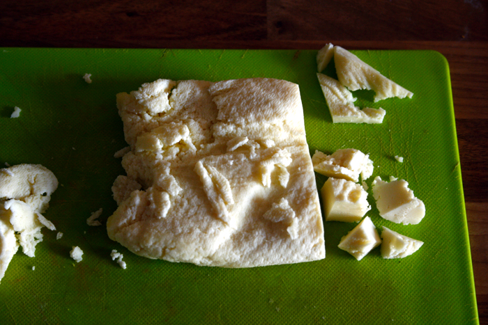 Wenn alles durchgelaufen ist, das Tuch an den Enden zusammenrollen und drücken, so dass die Flüssigkeit heraus gepresst wird. Nun das Tuch auf ein Schneidebrett legen und ein zweites Brett darauf legen, auf das man einen Topf oder etwas schweres stellt. So wird der Käse gepresst. Sobald er etwas abgekühlt ist, in den Kühlschrank legen und weiterhin beschweren. So kann er 2 – 3 Tage bis zur Verarbeitung aufbewahrt werden. Anschließend muss man ihn nur noch würfeln.