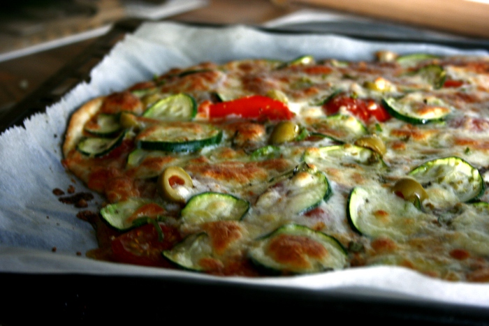 Ein Backblech mit Backpapier auslegen, mit Olivenöl bestreichen und den Teig sehr dünn auf dem Blech ausrollen (ca. 3 mm hoch!). Tomatensauce auf dem Teig verteilen, darüber zuerst die Tomatenscheiben, dann die Zucchinischeiben legen. Pepperoni, Schalotten und Oliven gleichmäßig verteilen und für die Vegetarier alles großzügig mit Käse bestreuen. Basilikum hacken und darüber verstreuen.