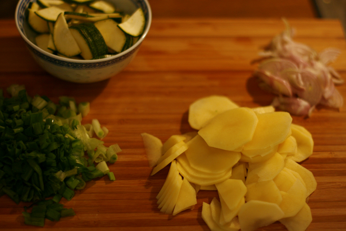 In der Zwischenzeit kann man die Zucchini halbieren und in feine Streifen schneiden, die Kartoffeln schälen und in feine Scheiben schneiden, Zwiebel und Frühlingszwiebel ebenfalls fein hacken oder in Ringe schneiden.
