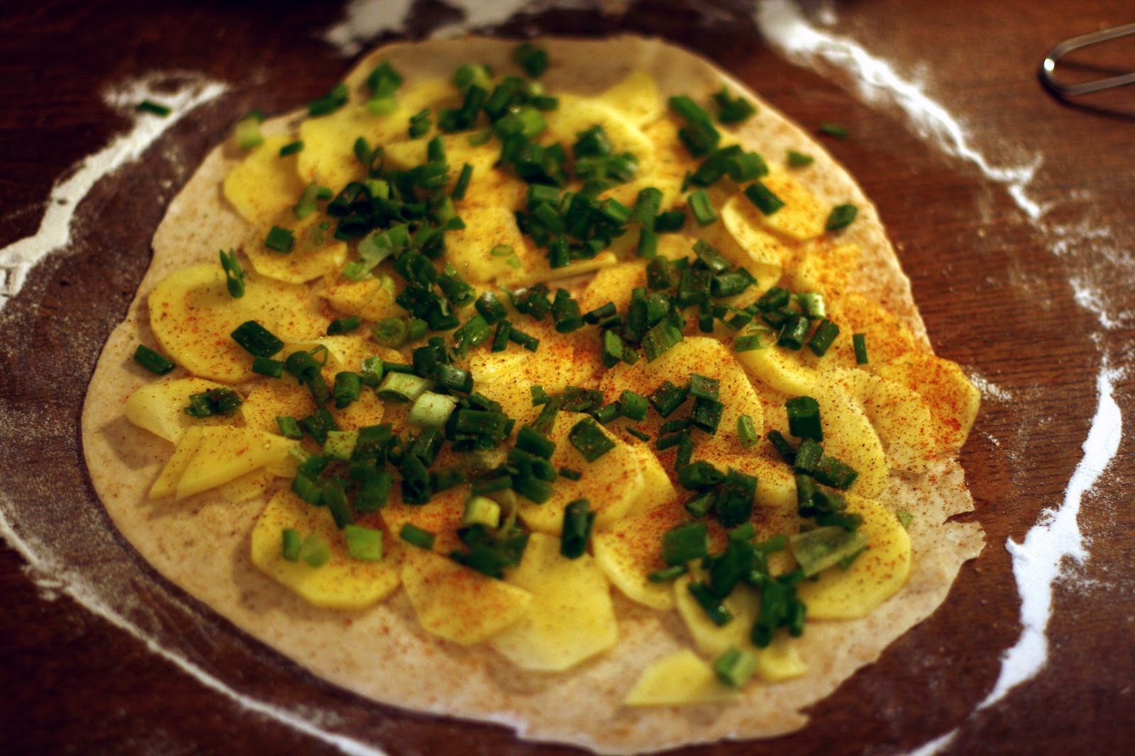 Für die Kartoffelpizza den Teigfladen wenn gewünscht in der nicht-veganen Variante mit Creme fraîche bestreichen, darauf die dünnen Kartoffelscheiben legen, mit Salz und Pfeffer würzen und mit den Frühlingszwiebel-Ringen bestreuen. Wenn gewünscht auch hier etwas Gouda dazugeben.